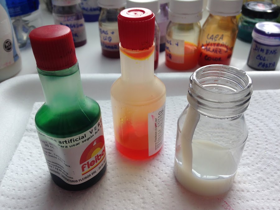 Para comenzar se trata de mezclar la base que es el Barniz Dimensional con los Colorantes.