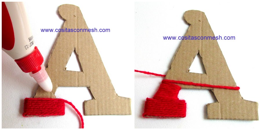 5.-Solo en algunas zonas de las letras pondré un poco de pegamento para que el hilo quede fijo, no es necesario usarlo para forrar toda la letra con el hilo.