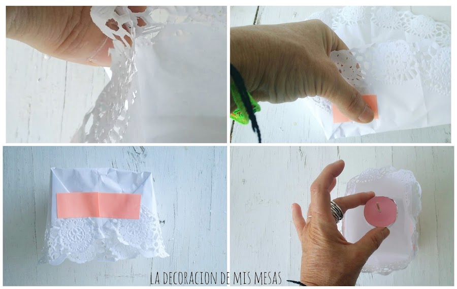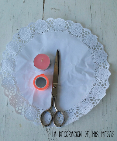 Estas linternas flotantes las haremos con blondas redondas de pastelería (tamaño medio 25-30 cm de diámetro), un poco de fixo o washi-tape y velas de té.