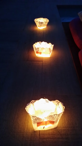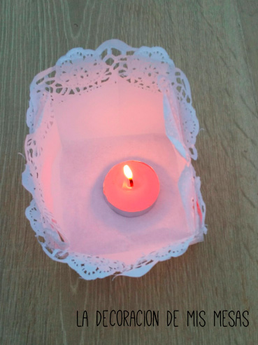 No tengaís miedo, que el papel de la blonda no se empapará y no caerán al fondo, estarán perfectos y van a durar lo que dure la vela ( en mi caso duraron una media hora o así).