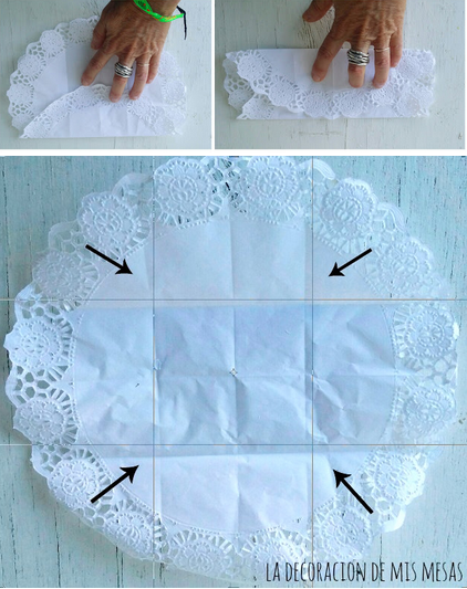 El proceso es muy sencillo, marcaremos una serie de lineas en la blonda mediante dobleces, de manera que nos queden 4 angulos rectos en cada esquina que son las que fijaremos con un poco de fixo y que nos dará la forma semi cuadrada que queremos.