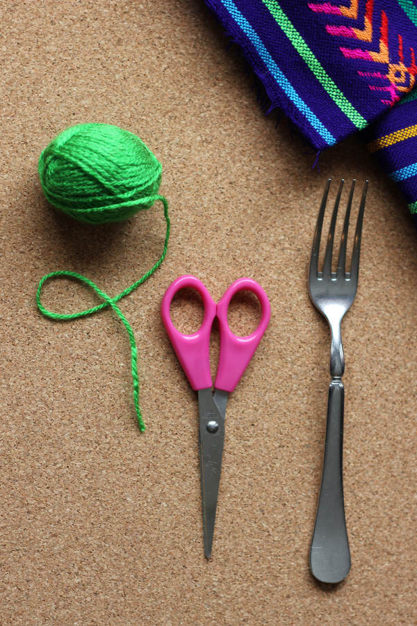 Luego, atamos una tira de lana por el centro de lana envuelta en el tenedor.