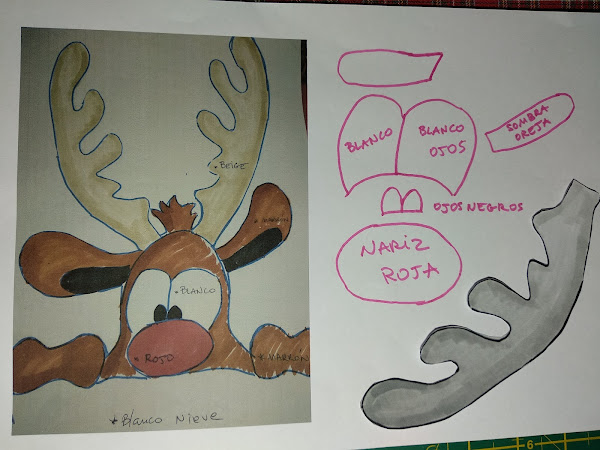 En esta foto aparecen las diferentes partes del reno: cuernos, ojos, naríz...falta la nieve que está en la base del reno.