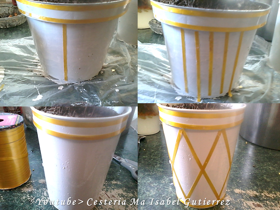 Con silicón, pegamos tiras de la cinta alrededor del borde de las macetas...