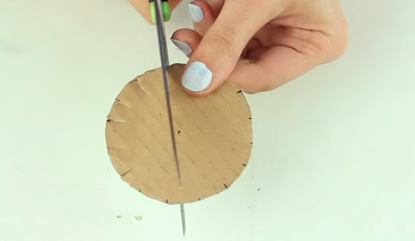 1. Dibuja el círculo en el cartón del diámetro que quieras tu mandala. A continuación usa la regla para dividir el círculo en dieciséis partes iguales y haz marcas en los extremos de cada una.2. Recorta la circunferencia y haz pequeños cortes en cada marca.