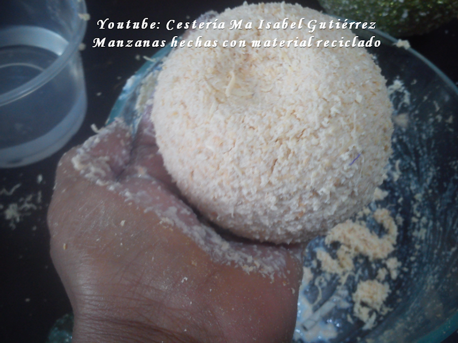 Esta masa es muy moldeable, aunque a primera vista no lo parezca, tomamos en las manos la masa y empezamos a moldear, verás que fácil es formar una esfera bastante redonda, a la vez que moldeamos, vamos apretando la masa para que salga el exceso de agua... podemos formar manzanas bajitas o mas alargadas, según tu gusto. Al final, con nuestros dedos, ahuecamos un poco la parte de arriba de la manzana, ahí pegaremos un pequeño tallo y hojas. Debemos dejar secar dos o tres días si el clima es soleado y con buen aire, en caso contrario, esperamos hasta que notemos que la pieza se puso algo pesada y muy dura, también adquiere un color mas intenso...