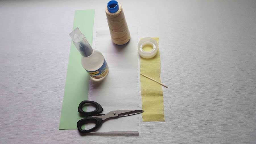 Tijeras, pegamento, hilo, celo y un palillo de dientes.