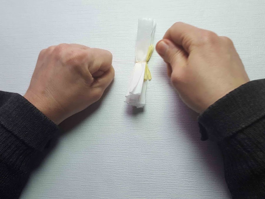 Hacemos unos pliegues en forma de abanico y lo atamos con el hilo.