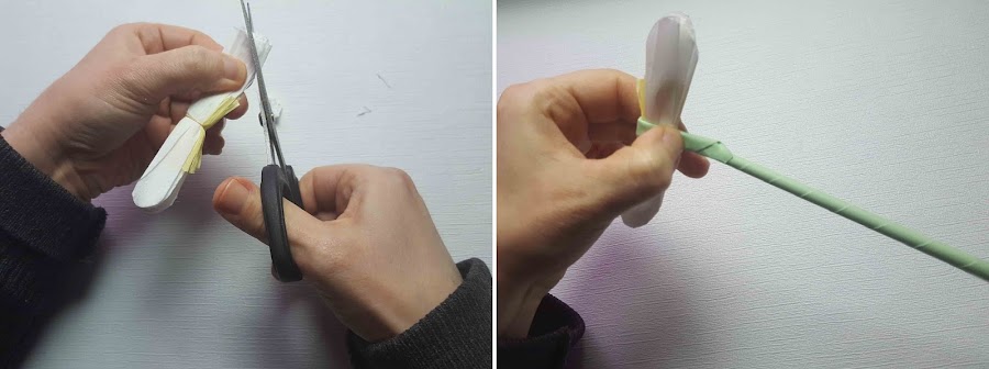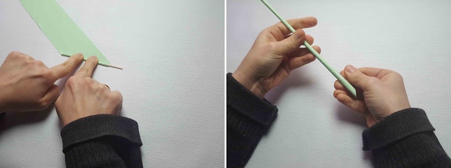 Comenzamos por hacer el tallo. Enrollamos la tira de papel verde con la ayuda de un palillo y lo pegamos con celo.
