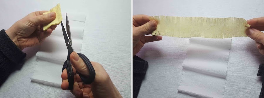 Doblamos el papel crepé amarillo a la mitad por dos veces y cortamos pequeñas tiras por ambos lados del papel. o desdoblamos y lo colocamos encima del papel blanco.
