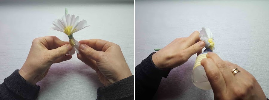 Abrimos la flor y aplicamos pegamento en las dos aberturas.