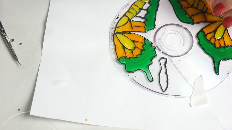 Para el cuerpito de la mariposa recorte u trocito de dvd con la forma y lo rellene con la pistola de silicona caliente y le coloque sobre la cabecita un trozo de hilo de nylon como antenitas.