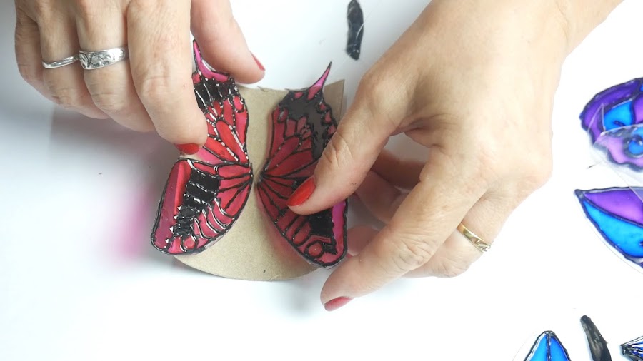 Termino con un ala y paso realizar la otra y así hasta terminar con cada mariposa. Lo dejamos secar muy bien antes de pintar.