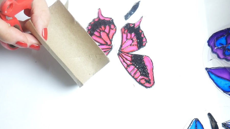 Para pegar las partes de la mariposa y que no queden planas recorte a la mitad un tubo de cartón que me va a hacer de contenedor de las alitas.