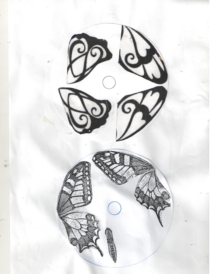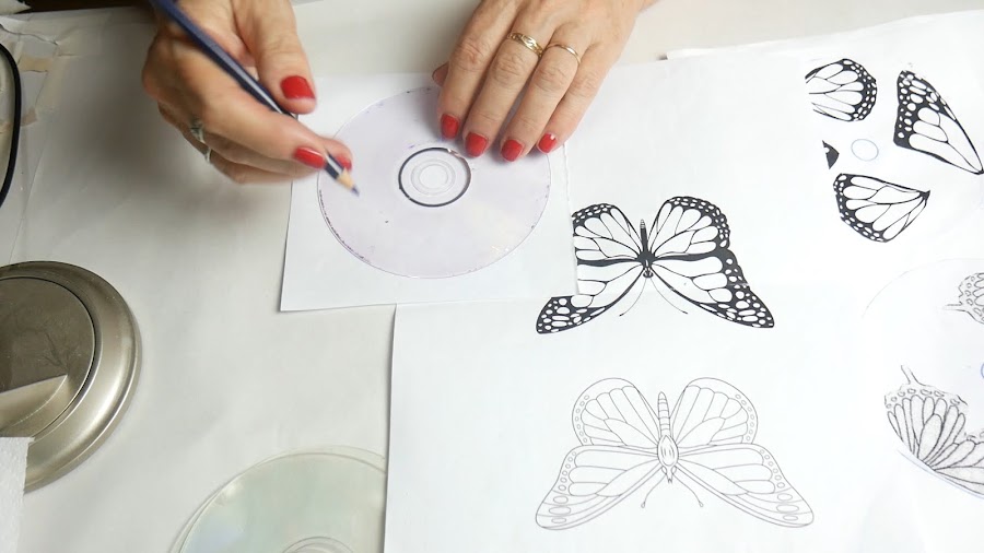 Sobre un papel marco el centro y los límites del cd, si la mariposa no es muy grande puedo recortarla por la mitad y ubicarla dentro del círculo, pero si es de un tamaño mayor tengo que recortar las 4 alitas para que quepan dentro de mi espacio.