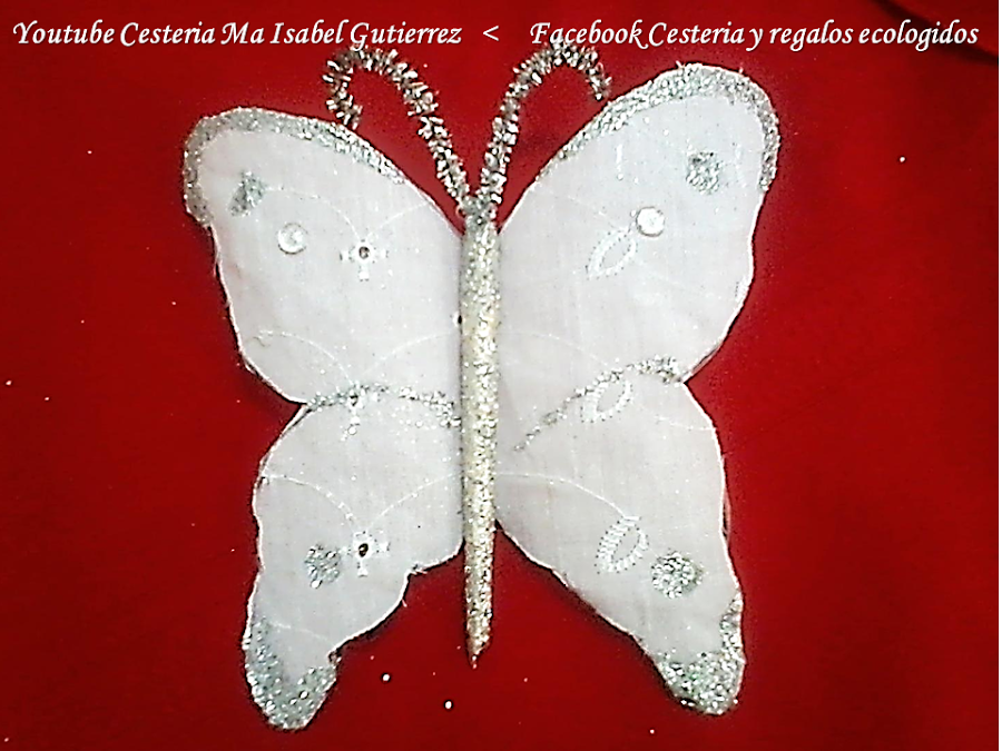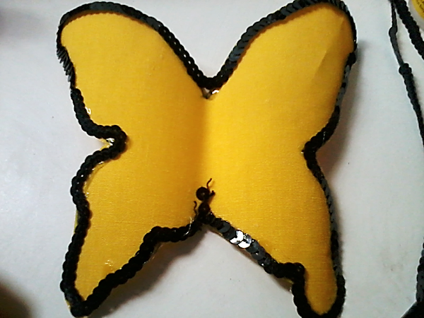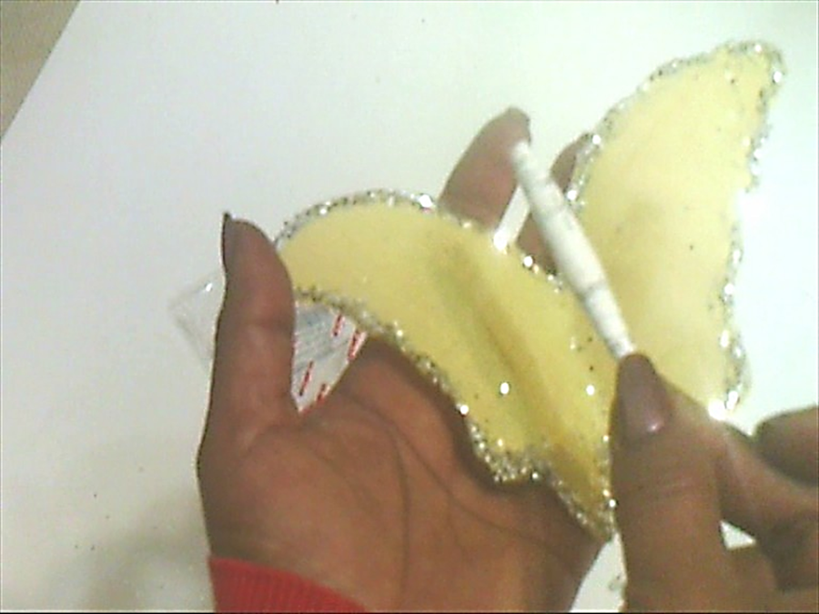 La decoracion es al gusto, en este caso le pegue una tira de lentejuelas por toda la orilla de la mariposa y algunas falsas gemas, pero tambien podemos usar diamantina o chaquira...