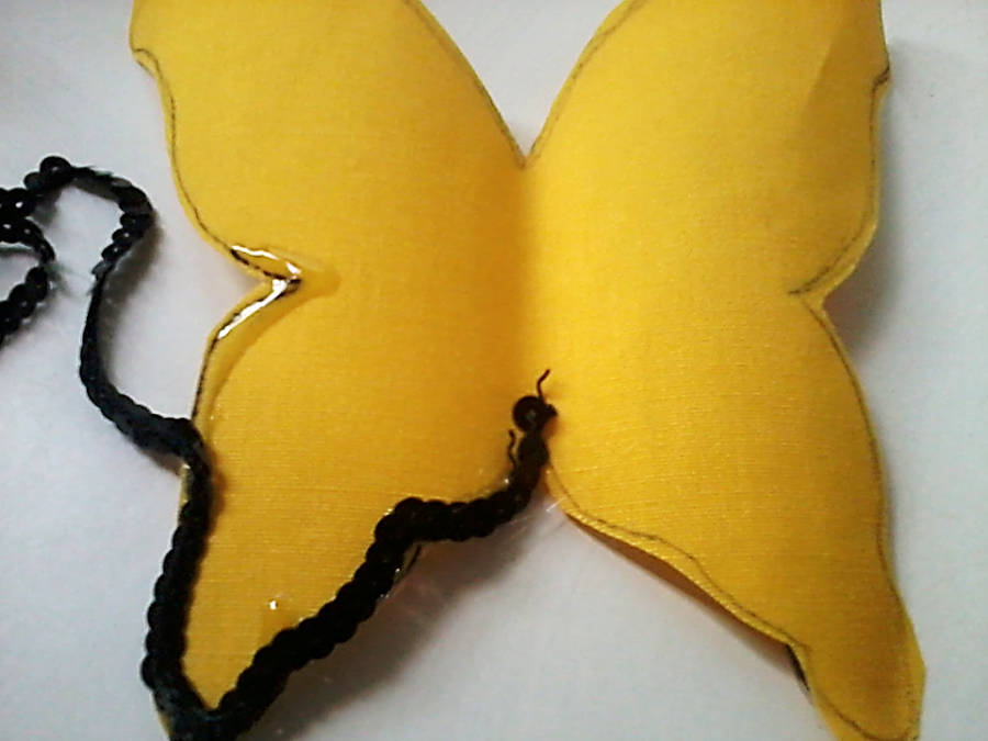 Ponemos silicon por toda la orilla y el centro de la mariposa de plastico, muy poco silicon para que no traspase la tela y pegamos...