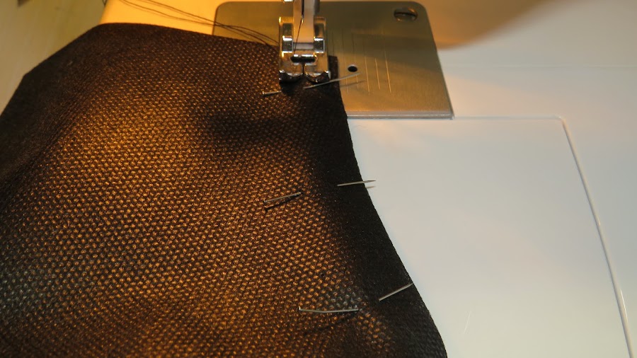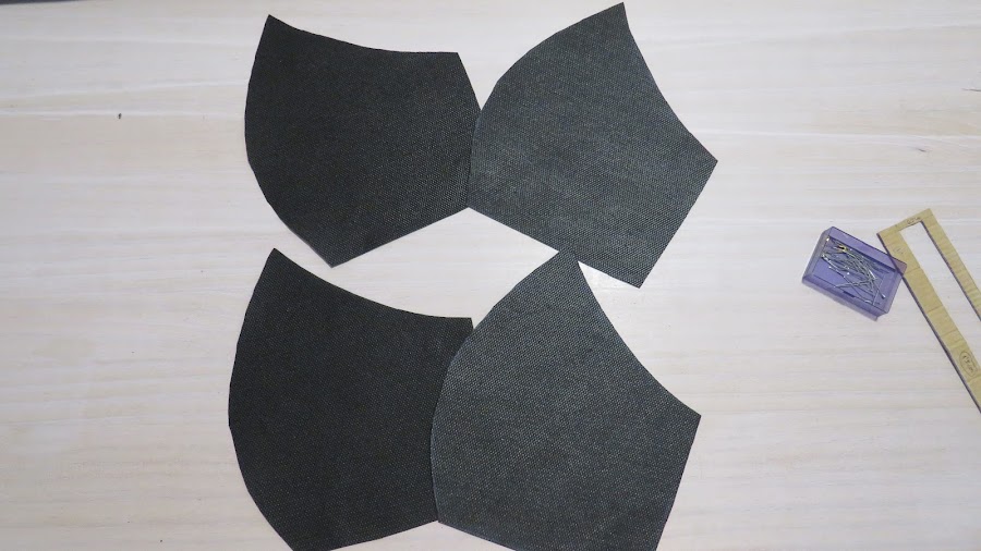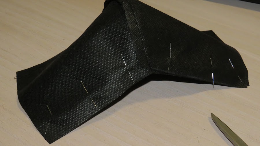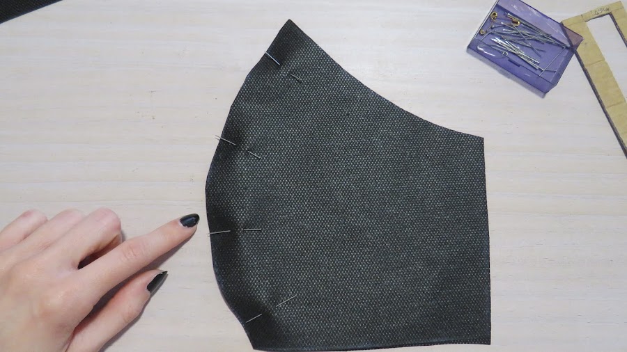 Unimos derecho con derecho de ambas piezas ya unidas y colocamos alfileres por la zona curva superior