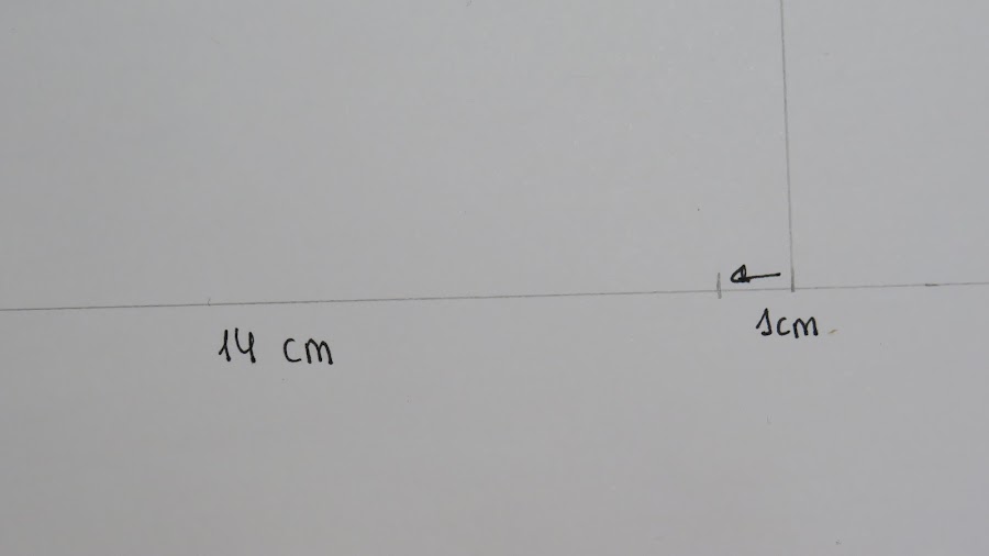 Sobre la línea horizontal, la de 14 cm, marcamos 12 cm desde el punto derecho, como ves en la imagen, y donde esté el 0, hacemos una marca