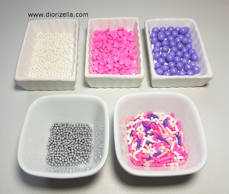Lo que necesitaras son sprinkles en diferentes formas y colores. Yo estoy usando los jimmies que son los sprinkles alargados. Estoy usando jimmies en los colores rosa, blanco y violeta. También estoy usando, nonpareils (bolitas pequeñas) de color plata y perlas pequeñas blancas y perlas grandes color violeta. Para darle el toque festivo o temático estoy usando sprinkles en forma de corazón en el color rosa.