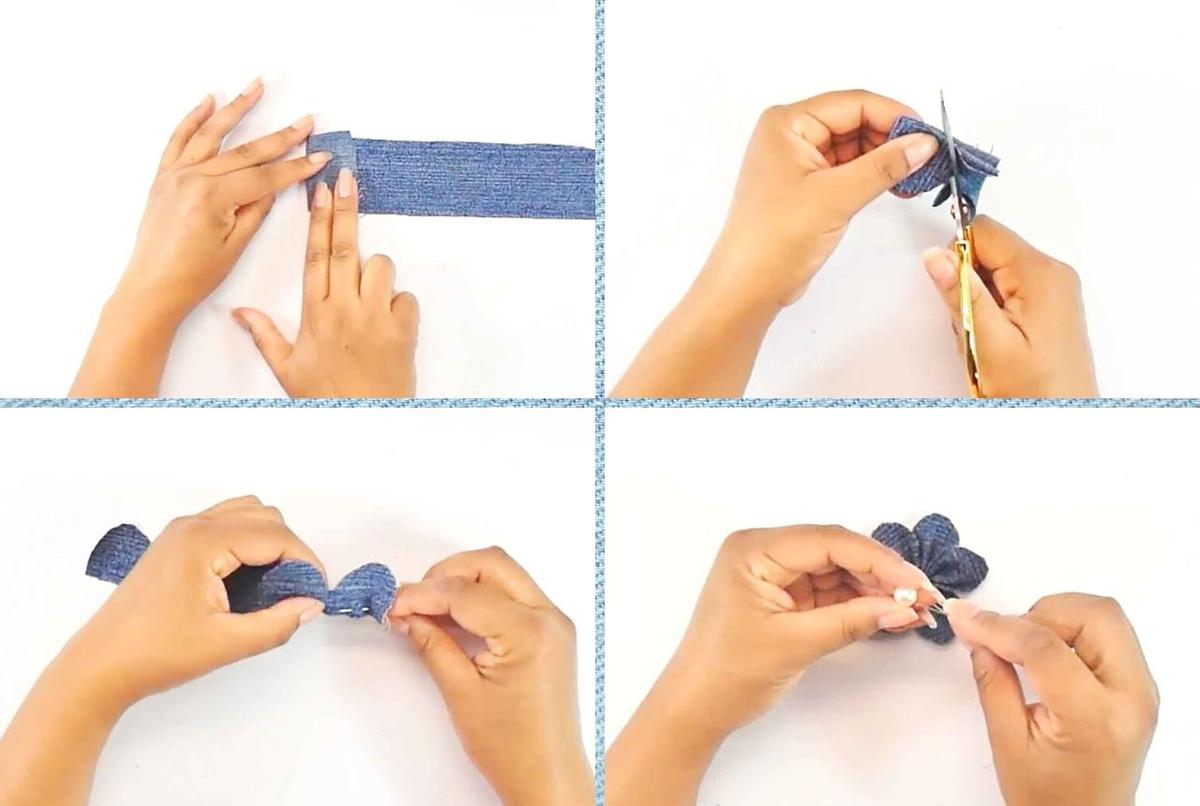 Para hacer flores con jeans, dobla una tira de tela en forma de acordeón, con una medida de 3 o 3 cm aproximadamente en cada tramo, hasta tener 5 veces la tela.