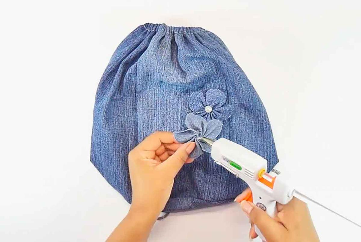 Decora tu mochila con las flores de jeans a tu gusto.