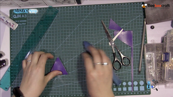 Para el siguiente monedero, el triangular, utilizo una plancha de polipiel morada, y marco por detrás 4 triángulos de 7cm de lado.