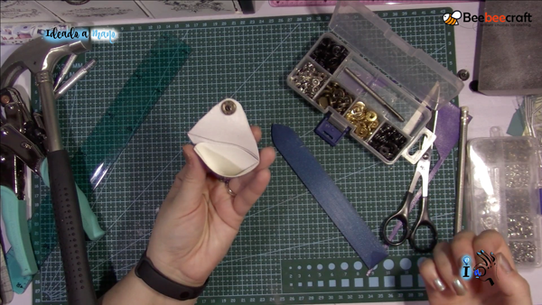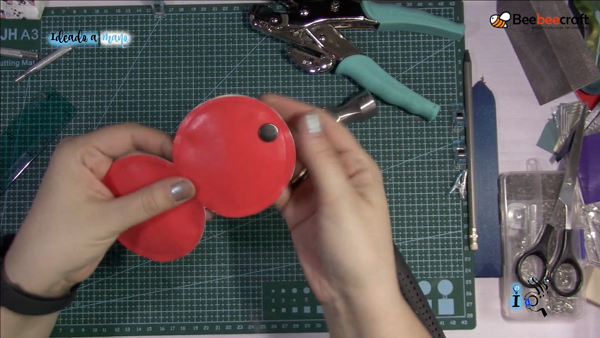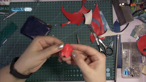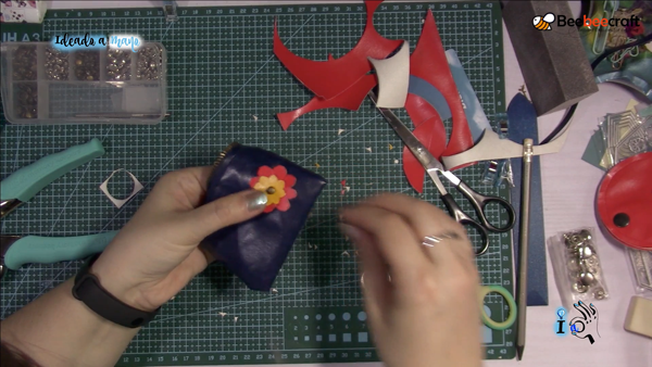 Hacemos un agujerito en el centro de las flores y las colocamos con un snap de metal.