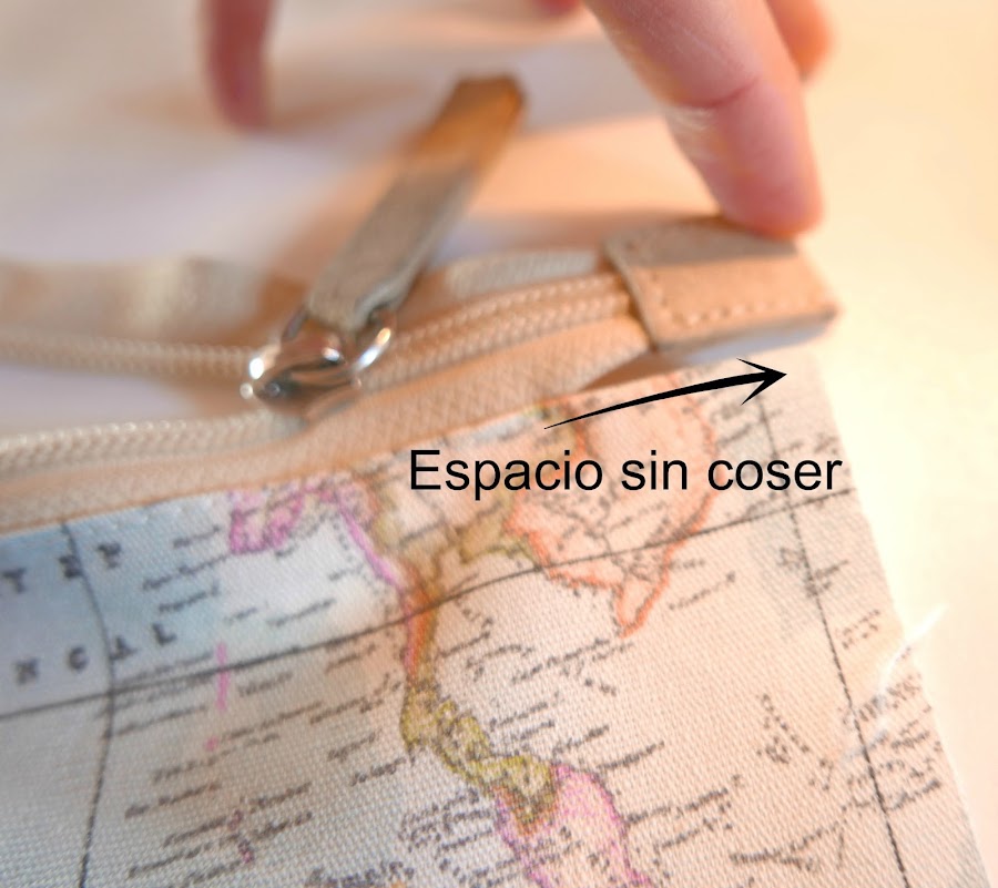 Con los remates en piel que tiene la cremallera, debemos dejar un espacio sin coser, para que queden por fuera.