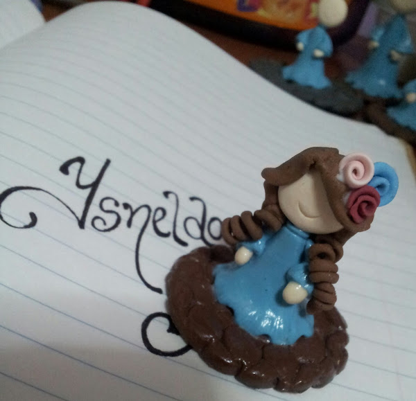 3- Para las rositas, con tiras aplanaditas, hice rollitos de masa flexible de los colores: azul, vino tinto y rosa claro. Y las coloqué en el cabello.
