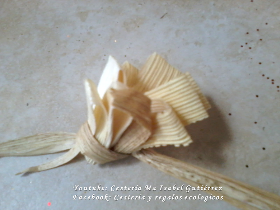 Tomamos una tira y empezando por un extremo, doblamos aproximadamente unos tres centímetros, y vamos haciendo mas dobleces hasta que se termine esa tira, tomamos otra y hacemos lo mismo hasta alcanzar el grosor adecuado para el centro de nuestra flor, amarramos con otra tira de hoja de maíz, pintamos en color dorado y dejamos caer un poco de diamantina dorada...
