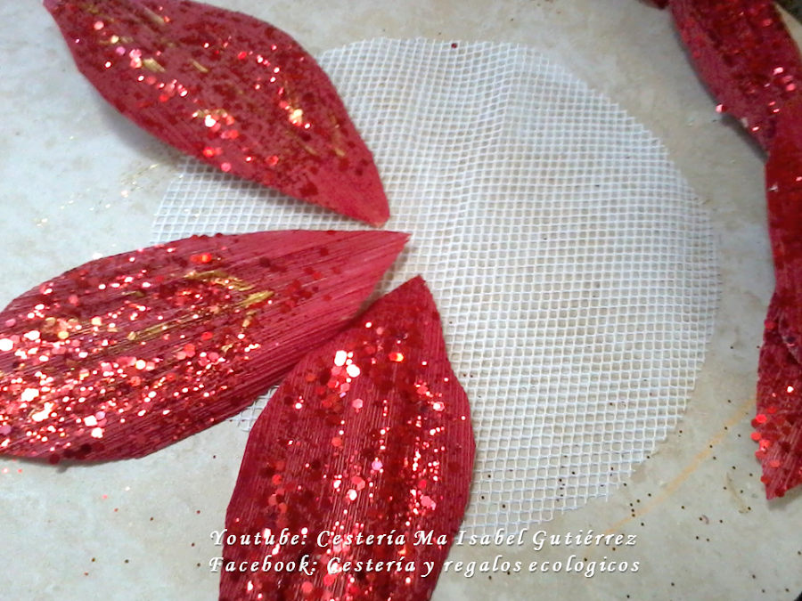 Pintamos cada pétalo en el color de nuestra preferencia, y estando aún fresca la pintura, dejamos caer diamantina o brillantina en el mismo color; aparte, cortamos una rueda de tul grueso y ahí, centrando, empezamos a pegar con silicón, seis hojas grandes...