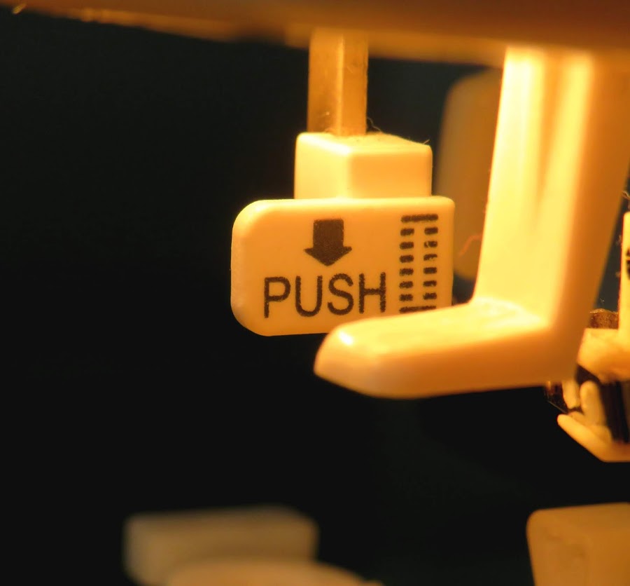 Colocamos el prensatelas. Ten en cuenta que la dirección donde esta el botón, debe de quedar por la parte de atrás de donde nosotros miramos nuestra máquina