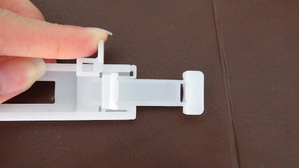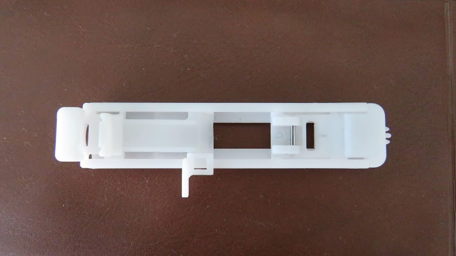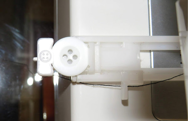 Esto sirve para determinar el largo de ojal. La máquina, mientras va cosiendo uno de los lados del ojal, cuando llega al extremo, empuja esta pieza para dar la vuelta y coser el otro lado. Esto se logra a que, gracias al medidor de botón, que fue donde colocamos el botón para determinar el ancho del ojal, con una especie de palanca, lo empuja para cambiar el sentido