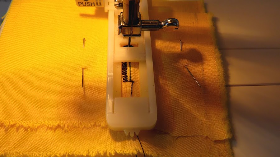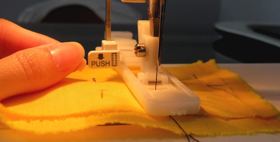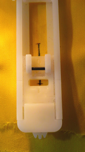 Recuerda que la línea que dibujamos de ojal debe de ir siempre justo por el centro de la abertura que tiene el prensatelas. Para ello, ayúdate de esta guía que trae el prensatelas, tiene como 3 piezas, necesitarás ir viendo que la línea pase por la pieza del centro