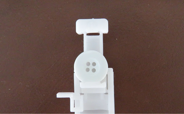 Necesitaremos el prensatelas para ojales. En el caso de las máquinas que lo tengan automático, como es el caso de este tutorial, será de esta forma. Además, tiene una pieza donde colocamos el botón, para coser el ojal a la medida de éste