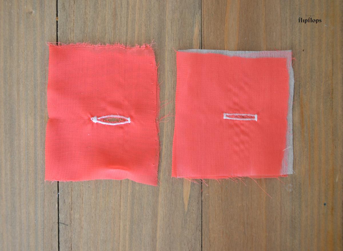 En la foto de arriba ves dos pruebas de ojal hechas con una tela fina, en ambas hay dos capas de tela pero la de la derecha además de capa doble le he puesto entretela( entre las dos capas de tela) . Como ves esto le ayuda a tener más cuerpo y que el ojal quede mucho más bonito