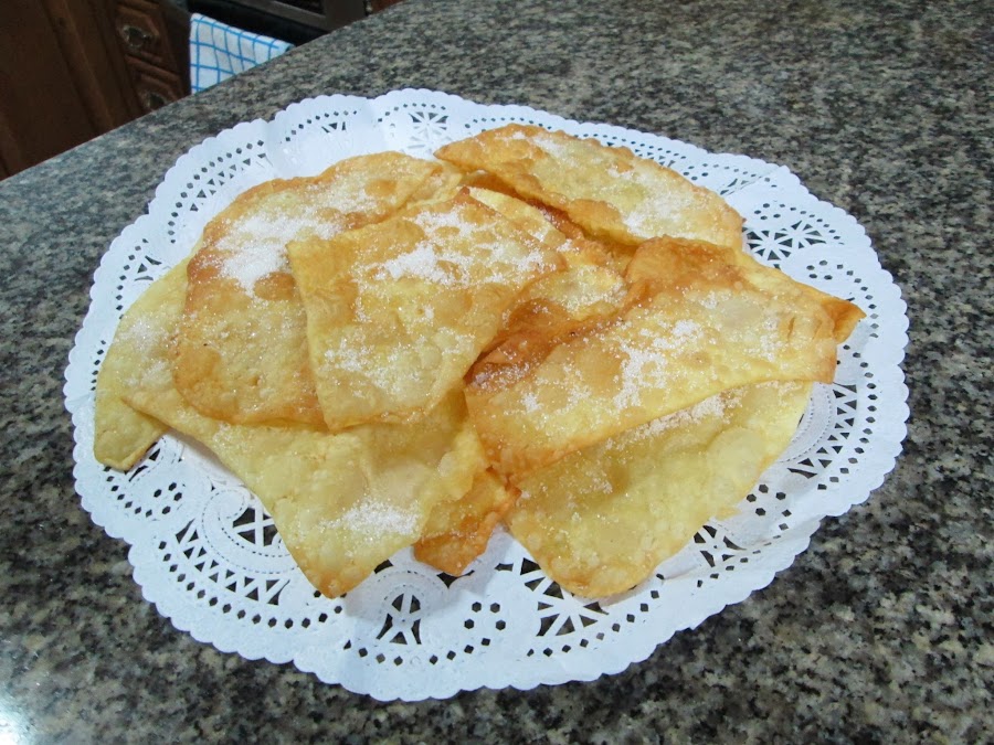 Hacerlas es muy fácil,como ya dije. Metéis todos los ingredientes en una amasadora o en un bol.Los juntáis todo amasando bien.Cuando ya esté compacto todo y se despegue de las manos ,ya están echas. Cortarlas en trocitos mas o menos grandes para estirarlos encima de un lecho de harina .Estirarlas hasta que quede una capa fina,cortarlas en trozos (como veis en las imágenes) y freírlas en abundante aceite.Cuando estén un poquito doradas quitarlas ,dejarlas escurrir en papel absorbente( para quitarles todo el aceite), pasarlas después a una fuente y espolvorear el azúcar por encima.