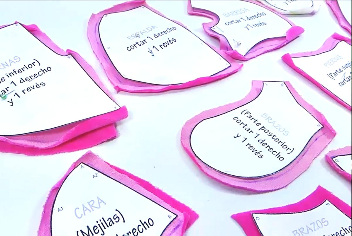 Cada pieza tiene letras por las que vas a guiar para coserlas entre sí y formar el osito.
