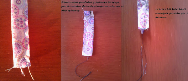 2.-Cosemos la tira y colocamos elástico. Doblamos por la mitad encarando los derechos y haciendo coincidir las líneas. Una vez que lo tenemos cosido le damos la vuelta, para ello damos unas pequeñas puntada en uno de los extremos de la tira y pasamos la aguja con el hilo por el interior de la tira. Una vez que la hemos sacado por el otro extremos tiramos del hilo hasta conseguir poner del derecho la tira.