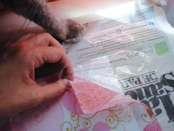 Ahora pon, sobre una hoja de papel de periódico, la cartulina y extiende encima el plástico de cocina dejando que sobresalga por los lados y que quede lo más estirado y sin arrugas posible. Encima coloca la servilleta y otra hoja de periódico