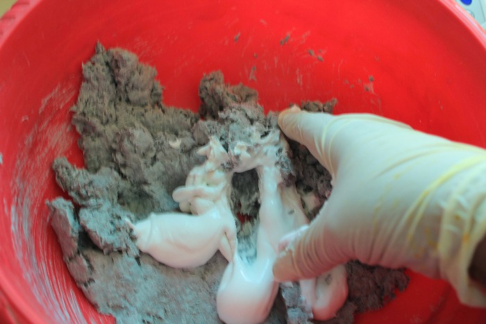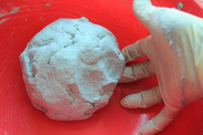 Revolvemos muy pero muy bien, preferentemente con la mano (y con guante!) así notaremos como la masa se convierte poco a poco en una pasta muy maleable, algo así como masa para hacer pizza, si se resquebraja fácilmente debemos adjuntarle un poco más de masilla/cola