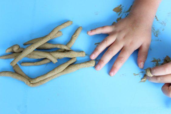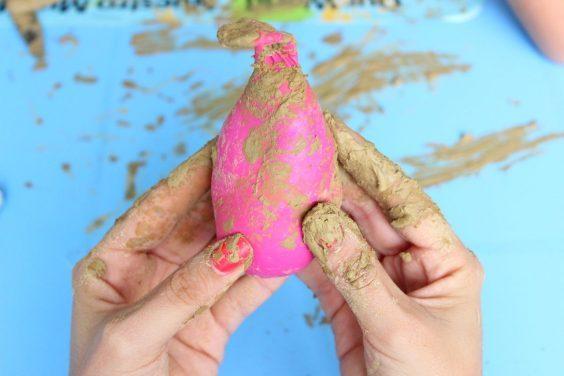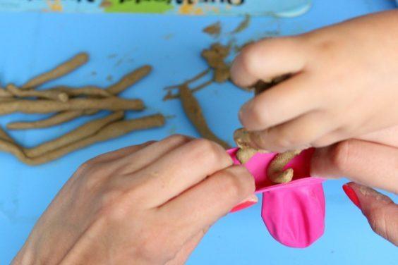 Amasar un poco la arcilla y hacer tiras pequeñas para luego introducir en el globo. Aquí vas a necesitar ayuda, mientras sostenés la boca del globo abierta, alguien deberá colocar la arcilla dentro.