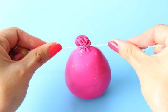 Cuando ya tengas suficiente cantidad de arcilla, atar el globo con un hilo fuerte. Luego cortar el sobrante de hilo y el cuello del globo.