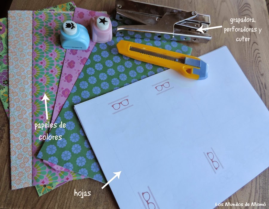 Los materiales necesarios son: papeles de colores, grapadora, perforadoras, cuter, regla, lápiz, hojas blancas impresas con dibujos (opcional) y hojas adhesivas de colores.