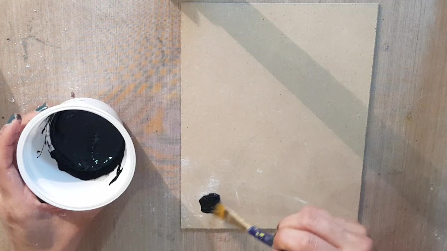 Mezclamos 3 partes de acrílico, con 1 de yeso con 1 de agua y pintamos la tabla, esta es mucho mas fluida y fácil de manejar, en esta ocasión tamicé el yeso para evitar los grumos.