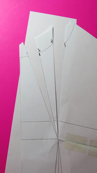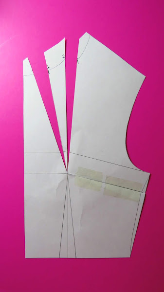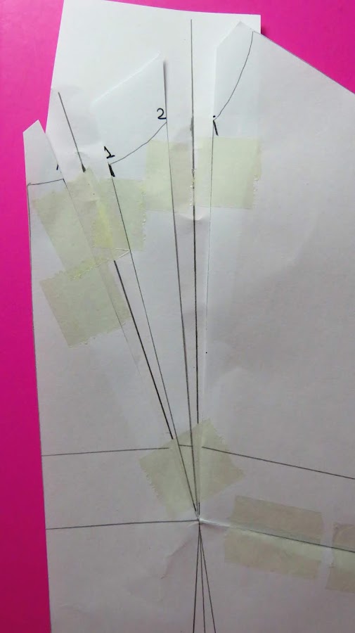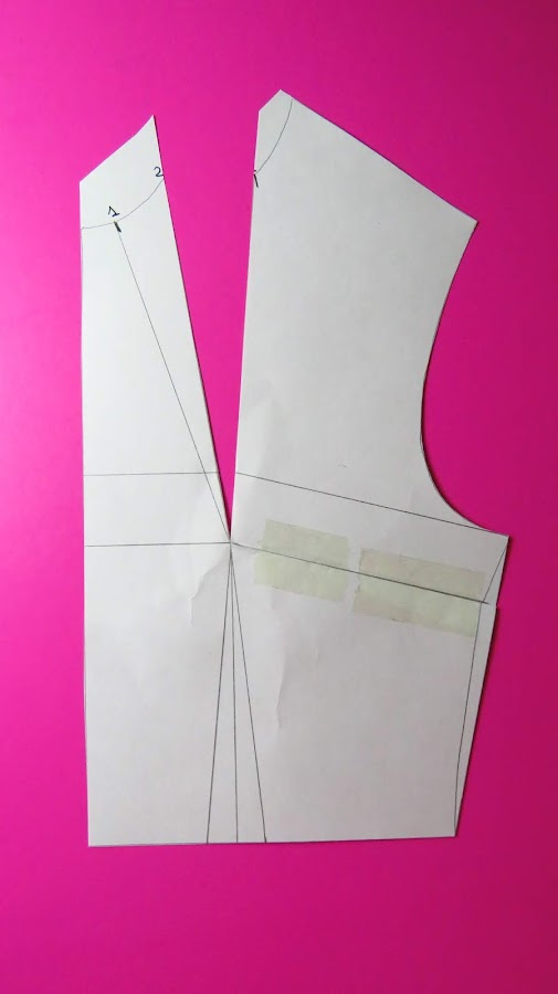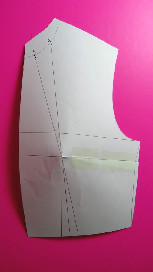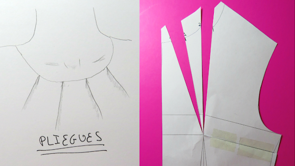 Abrimos uno de los dos pliegues, justo hasta el centro, para así abrir nuestro patrón, quede plano y trasladamos el volumen de la pinza de pecho hacia el pliegue.