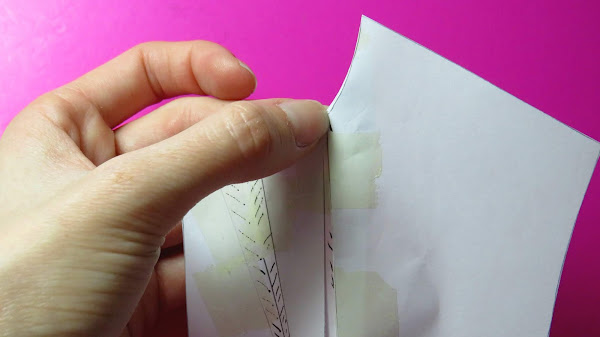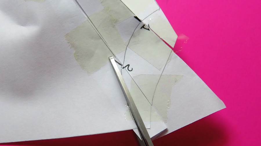 Pegamos celo de forma provisional, yo lo suelo hacer en el marguen que dejamos sin cortar, para que no me estropee el patrón, pero si ves que te cuesta que quede bien cerrado, coloca uno pequeñito en la zona justo del pliegue