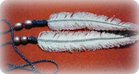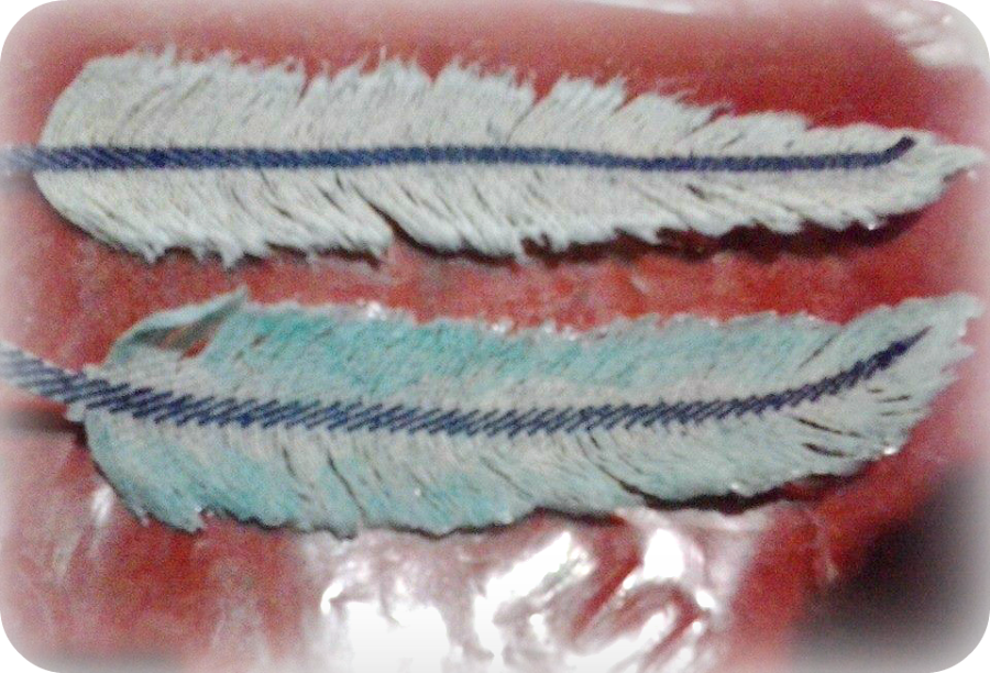 De forma sencilla anudo dando varias vueltas , de forma descuidada y abrupta , las hebras alrededor de la " colita " de la pluma , termino con un nudo doble y corto el sobrante , no es necesario pero yo le he aplicado agua y cola a todo el anudado para mayor fijación