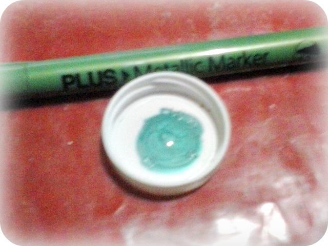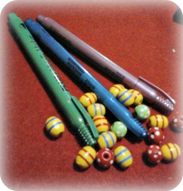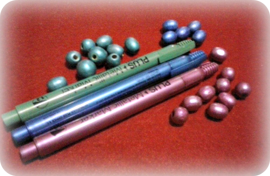En esta foto os muestro como han quedado las cuentas de madera y los rotuladores de los colores que he escogido , quedan con un bonito tono metálico , una vez secas les he dado una mano de cola blanca , con cuidado pues estos son marcadores al agua y se puede chafar el color .